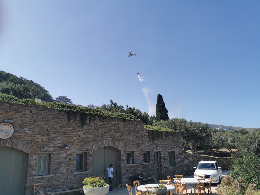 Επίσης, να προσθέσουμε τις ευχαριστίες του κτήματος και του οινοποιείου Κουρτέση και του ιδιοκτήτη του γειτονικού κτήματος προς τους εθελοντές δασοπυροσβέστες Νίκο Χαζάπη, τον Δημήτρη Χαζάπη και Ιώαννα Σαραβάνου που έδωσαν σκληρή μάχη μέσα στις φλόγες να σώσουν τα δύο αυτά κτήματα. Ακόμα να σημειώσουμε πως στον τόπο του συμβάντος είδαμε και τον υπεύθυνο Πολιτικής Προστασίας του Δήμου Άνδρου Γιάννη Μπακέλα. Τέλος να προσθέσουμε πως την ώρα που όλα κάπνιζαν γύρω και οι τελευταίες φλόγες έκαιγαν ακόμα ενώ τα ελικόπτερα συνέχιζαν ρίψεις επισημάναμε τέσσερα οχήματα με τεχνικούς του ΔΕΔΔΗΕ (το ένα γερανοφόρο) που ανηφόριζαν για να αρχίσουν τις επισκευές ώστε από απόψε μέχρι αύριο (έτσι μας είπαν να επανέλθει το ρεύμα στην πληγείσα περιοχή. Κάτι ιδιαίτερα σημαντικό για να επανέλθει η ζωή στον χτυπημένο από την φωτιά τόπο.