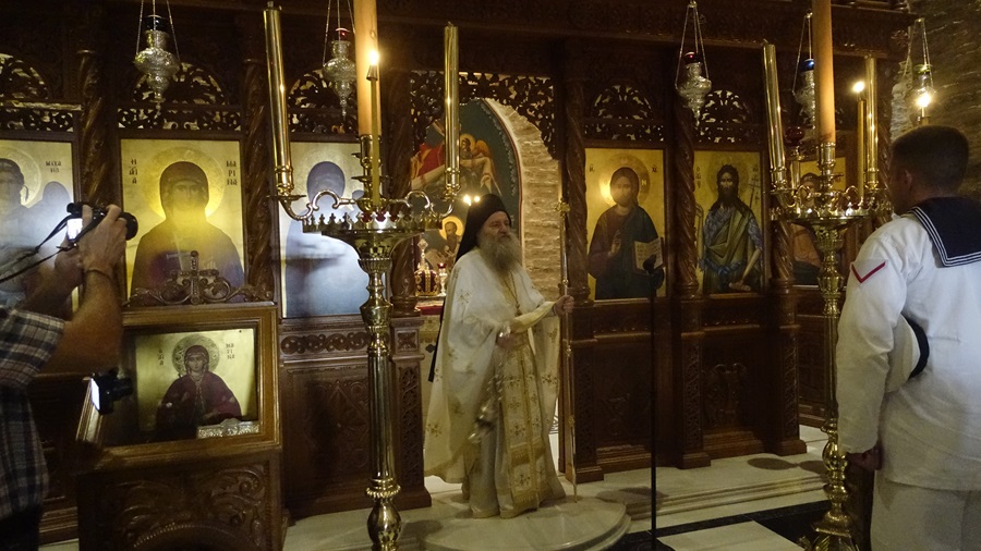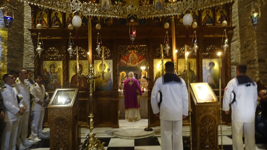 Γύρω στις 9:30 κόσμος περιορισμένος στο ναό. Όμως οι ναύτες της ναυτικής βάσης ήταν εκεί. Καλοκαιρινοί. Στα κάτασπρα. Παραστάτες της εικόνας.