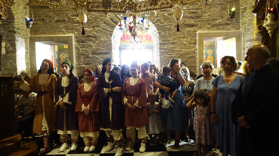 Όλες αυτές οι σκέψεις διέτρεξαν το νου στη διάρκεια της λειτουργίας στο μεγάλο μοναστήρι της Άνδρου. Καθώς η λειτουργία πήγαινε προς το σχόλασμα, μαζέψαμε την φωτογραφική μηχανή, τις ιστορίες και τις μακρινές σκέψεις. Και ξεκινήσαμε να βγούμε από το ναό. Εκείνη την ώρα έφτασαν βιαστικοί στο ναό και οι επίσημοι του χωριού. Ο δήμαρχος, η έπαρχος. Ακολούθησε ο πρώην δήμαρχος. Ήταν η ώρα των δημοσίων παρουσιών. Ήταν η ώρα της αναχώρησης έχοντας πακετάρει μνήμες, εικόνες, παρατηρήσεις και στιγμιότυπα.