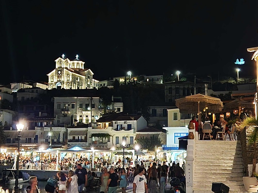 Γεμάτο το μικρό λιμανάκι και η μαρίνα με σκάφη. Η κοσμοπολίτικη Άνδρος είναι κι αυτή παρούσα. Η καλοκαιρινή Κυριακάτικη νύχτα της πρώτης Κυριακής του Αυγούστου ξεκινά τις δικές της διαδρομές...