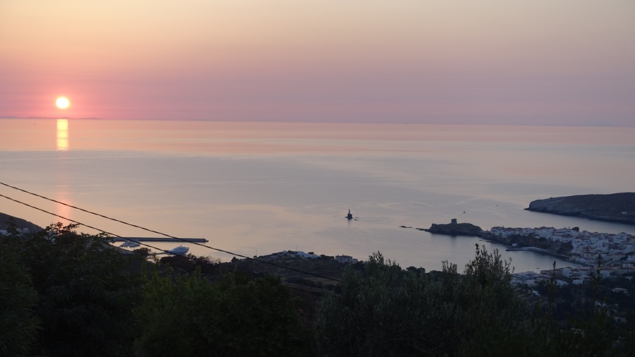 Ο ήλιος ξεκινά τη διαδρομή του στο φόντο τ΄ ουρανού. Η Χώρα της Άνδρου, όπως πάντα μαγική, απέναντι στο μεγαλείο της εναλλαγής του σκότους με το φως. Η μέρα ξεκινά. Κι εμείς ετοιμάζουμε την εκδρομή της μέρας στο νησί.