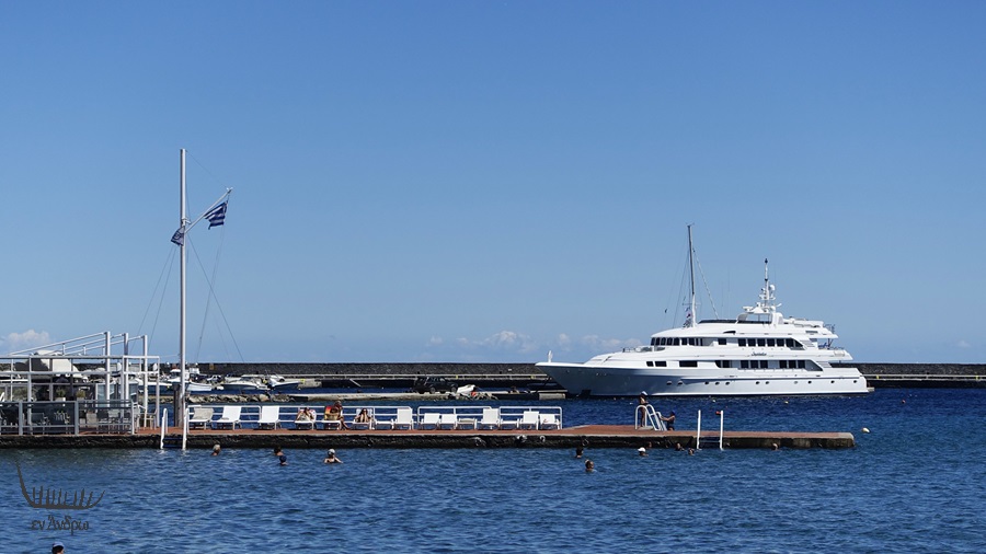 Νειμποριός. Ναυτικός Όμιλος Άνδρου. Ατμόσφαιρα χαλαρή, πολιτισμένη, κόσμος λίγος, ποιότητα και άνεση. Αρκετοί κολυμβητές με φόντο την υπέροχη θαλαμηγό. Κυριακή 15 Σεπτέμβρη.