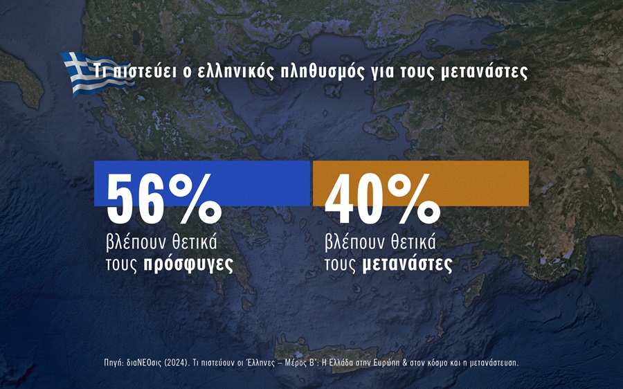 Εστιάζοντας στη μετανάστευση, η έρευνα κατέδειξε απόψεις και τάσεις τόσο των προσφύγων και μεταναστών όσο και των Ελλήνων προς αυτούς. Χαρακτηριστικά, το 2024, το 56% των Ελλήνων βλέπει θετικά τους πρόσφυγες και το 40% τους μετανάστες, ενώ η πλειοψηφία θεωρεί ότι η ένταξη μεταναστών «με κριτήρια και κανόνες» θα ωφελήσει την Ελλάδα στο δημογραφικό, στην οικονομία και στο ασφαλιστικό σύστημα, σύμφωνα με την έρευνα που βασίστηκε σε αντιπροσωπευτικό δείγμα του πληθυσμού.