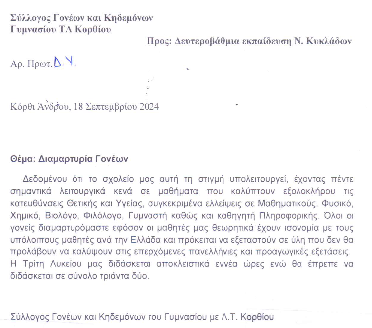 (Πλήρης η εκπαιδευτική εγκατάλειψη του Γυμνασίου-Λυκείου Κορθίου όπως γράφει ο Σύλλογος Γονέων και Κηδεμόνων. Τελειώνει ο Σεπτέμβριος και στο Λύκειο τα παιδιά της Τρίτης Τάξης κάνουν μόνο 9 ώρες μάθημα την εβδομάδα αντί για 32!!! Δεν υπάρχουν καθηγητές Φυσικής, Μαθηματικών, Χημείας, Βιολογίας, Φιλολογίας, Πληροφορικής και Γυμναστικής!!! Η διαμαρτυρία που έστειλε ο Σύλλογος Γονέων του σχολείου στο σάιτ μας το Σάββατο 21/9 καθυστέρησε να δημοσιευτεί λόγω του ότι η επιστολή στο ηλεκτρονικό ταχυδρομείο είχε πάει κατά λάθος στα "ανεπιθύμητα" και αργήσαμε να την εντοπίσουμε. Ζητάμε συγνώμη για την καθυστέρηση και συνυπογράφουμε τα αιτήματα των διαμαρτυρόμενων γονέων και κηδεμόνων ζητώντας από τον δήμαρχο να παρέμβει στο υπουργείο Παιδείας για την ανεπίτρεπτη εκπαιδευτική κατάσταση που επικρατεί στο Κόρθι - ΕΝ ΑΝΔΡΩ)