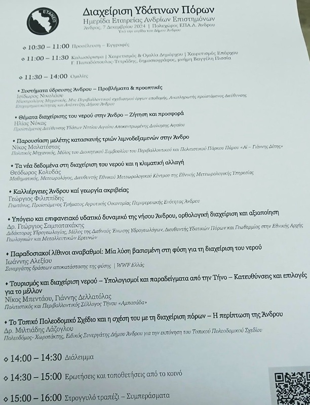 Η ημερίδα της Ένωσης Ανδρίων Επιστημόνων που έγινε στην Χώρα της Άνδρου το Σάββατο 7 Δεκεμβρίου 2024 ήταν η πρώτη σοβαρή προσπάθεια προσέγγισης του μεγάλου και απειλητικού ζητήματος της λειψυδρίας για την οποία γράφαμε εδώ και ενάμιση χρόνο από τις στήλες αυτές και ουδείς έδωσε σημασία. Ακόμα και στις περσινές εκλογές το θέμα ούτε αναφέρθηκε από τους δύο υποψηφίους δημάρχους. Σα να μην υπήρχε. Μόνο η απερχόμενη διοίκηση στον απολογισμό της απλώς ανέφερε τις βελτιώσεις και ανακαινίσεις του δικτύου με την εφαρμογή της τηλεμετρίας, την εισαγωγή ηλεκτρονικών μετρητών και την ανακαίνιση των δεξαμενών. Νερό θεώρησε πως θα είχαμε για πάντα! Αρκούσε η περικοπή των διαρροών και του παράνομου ποτίσματος!