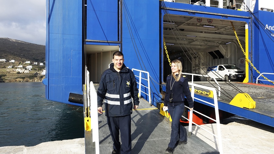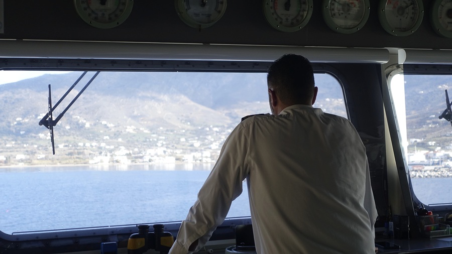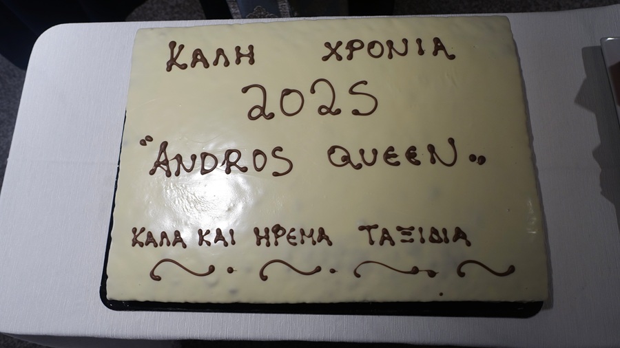 Η μέρα αλκυονίδα. Δοξαστική, λαμπερή, αστραφτερή. Πρωινό της 2ας Ιανουαρίου 2025. Στην γέφυρα του ANDROS QUEEN με τον καπετάν Θανάση και το πλήρωμα της γέφυρας για την πρώτη άφιξη πλοίου της γραμμής μας από Ραφήνα. Το πρώτο πλοίο, το ΑΡΤΕΜΙΣ, είχε πιάσει Άνδρο λίγο μετά τα μεσάνυχτα. Το ANDROS QUEEN ήταν το δεύτερο πλοίο.