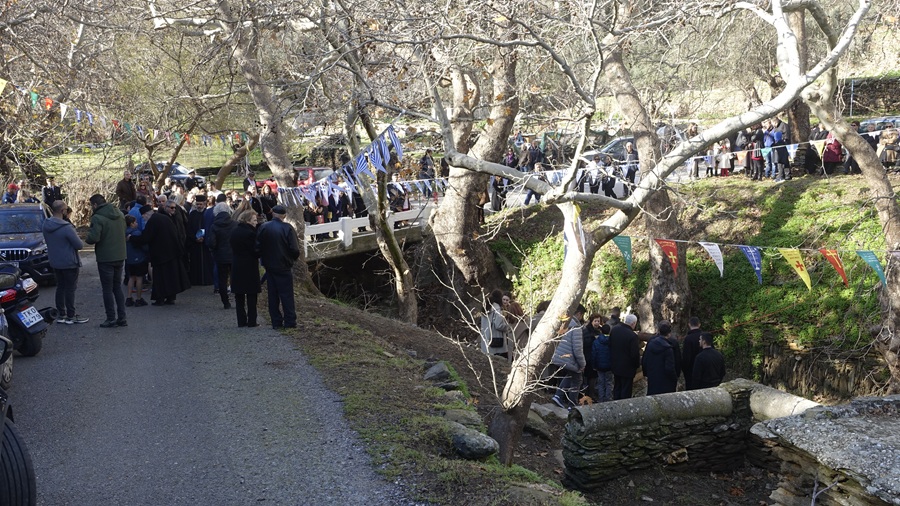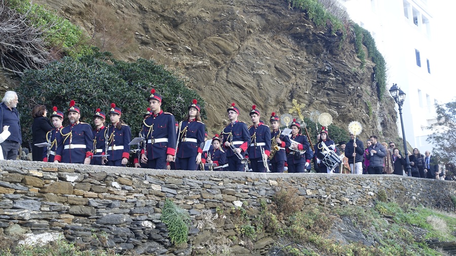 Εδώ η τελετή ξεκινά με τραγούδια και κάλαντα και τοπικούς μουσικούς. Αλλά και αναμονή! Για να έρθουν κι άλλοι από Χώρα. Μετά τη ρίψη του σταυρού στη θάλασσα ήρθε η ώρα της ρίψης του σταυρού στον ποταμό. Έχει αυτό το προσόν η Άνδρος: να περικλείεται από θάλασσα και να έχει και αρκετά μικρά ποτάμια.