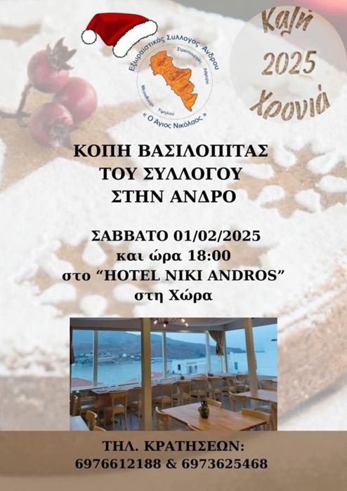 Στο ξενοδοχείου “Νίκη”, το βράδυ της Παρασκευής, 24 Ιανουαρίου, πραγματοποιήθηκε η εκδήλωση της κοπής της Αγιοβασιλόπιττας του Συλλόγου Φολκς Ανγκλέ. Χόρεψαν μέλη από το παιδικό, εφηβικό και μικτό τμήμα των ενηλίκων του Συλλόγου.