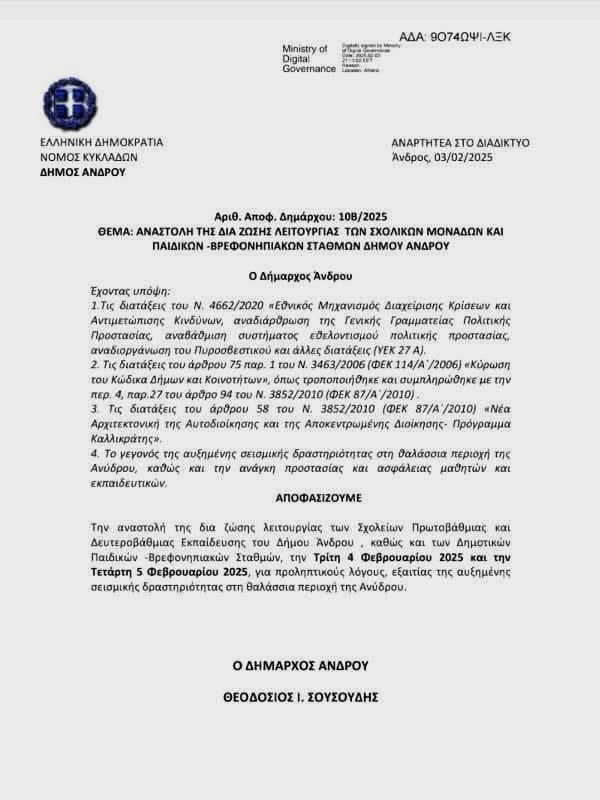 Με απόφαση δημάρχου κλείνουν τα σχολεία πρωτοβάθμιας, δευτεροβάθμιας εκπαίδευσης, καθώς και οι παιδικοί και βρεφονηπιακοί σταθμοί του νησιού. Ο λόγος όπως γράφει η ανακοίνωση του δημάρχου είναι η "αυξημένη σεισμική δραστηριότητα στη θαλάσσια περιοχή της Ανύδρου"! Η οποία περιοχή είναι μεταξύ Σαντορίνης και Αμοργού!