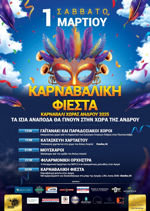 Το Σάββατο 1 Μαρτίου θα χορέψουμε με το Χορευτικό του Συλλόγου Γυναικών Άνδρου στην Πλατεία Καΐρη, θα φτιάξουμε τον χαρταετό μας στο χώρο του Φολκς Ανγκλέ, θα γελάσουμε με τους "μούσκαρους" που θα ξεχυθούν στον πεζόδρομο το βράδυ, θα απολαύσουμε αποκριάτικες μελωδίες από την Φιλαρμονική Ορχήστρα του Μουσικού Συλλόγου Άνδρου και θα διασκεδάσουμε μεταμφιεσμένοι στα μπαρ της Αγοράς.