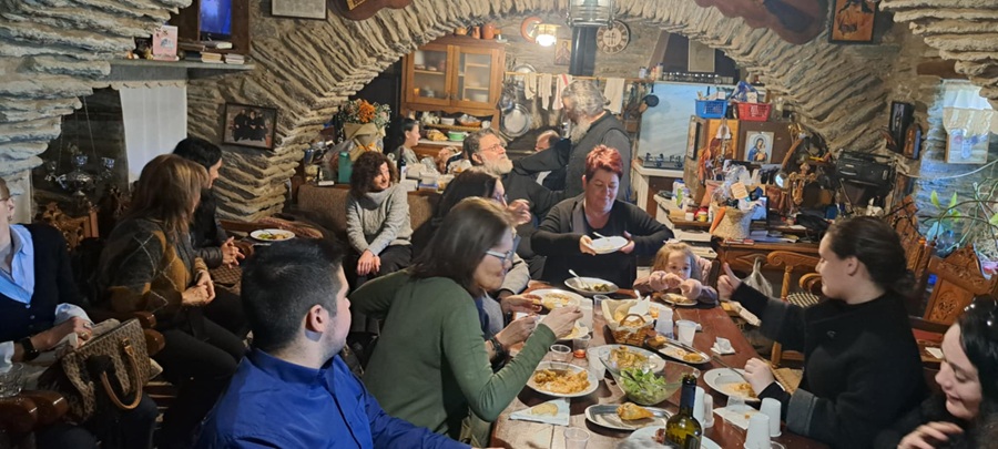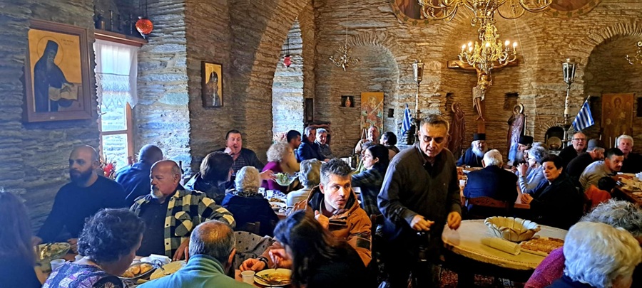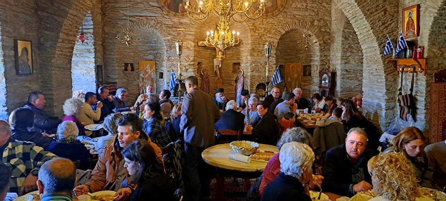 Πολλοί λοιπόν οι προσερχόμενοι όλο το πρωινό. Μεγάλη κοσμοσυρροή. Και πλήθος οι καφέδες, τα γλυκά και τα κεράσματα προς όλους. Και βεβαίως κατά τις 12: 00 το μεσημέρι όλοι οι παραβρισκόμενοι πέρασαν για φαγητό. Πιλάφι με σουπιές κοκκινιστές, κόκκινο κρασί, ψωμί, ταραμοσαλάτα και νηστίσιμα. Οι μάγειρες πολλοί και διαλεκτοί. Άλλος από το Κόρθι, άλλος από το Μπατσί. Οι σερβιτόροι - φίλοι της Μονής - προσέτρεξαν από παντού!