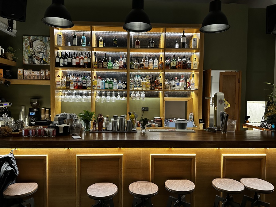 Πάνω αριστερά, ψηλά στο μπαρ, μια καλλιτεχνική φωτογραφία του Μπόνη, με την μοντερνίστικη επιζωγράφιση, παραπέμπει στην παράδοση του στεκιού.