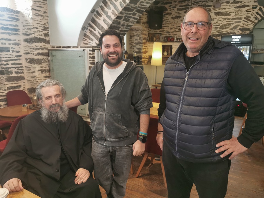 Λίγο πριν φύγουμε πάμε στο Λάας για καφέ. Και πετυχαίνουμε τους επαγγελματίες της περιοχής. Ο Βασίλης Μπατής και ο Γιώργος Σιγάλας. Δύο ξεχωριστές επιχειρήσεις εστίασης. Ποιοτικές και γι' αυτό δημοφιλής. . Ευχαριστημένοι από ένα ζωηρό 4τραήμερο. Μαζί και ο πατήρ Αέτιος. Περίφροντις. Χαρές μιας απροσδόκητης συνάντησης. Και μετά και ένα τηλεφώνημα. Από την Μαριγγέλα Γρηγορίου. "καλώς ήρθατε...". "Λάθος", απαντώ. "Καλή αναχώρηση, επιστρέφω σε τέσσερις μέρες" απαντώ.