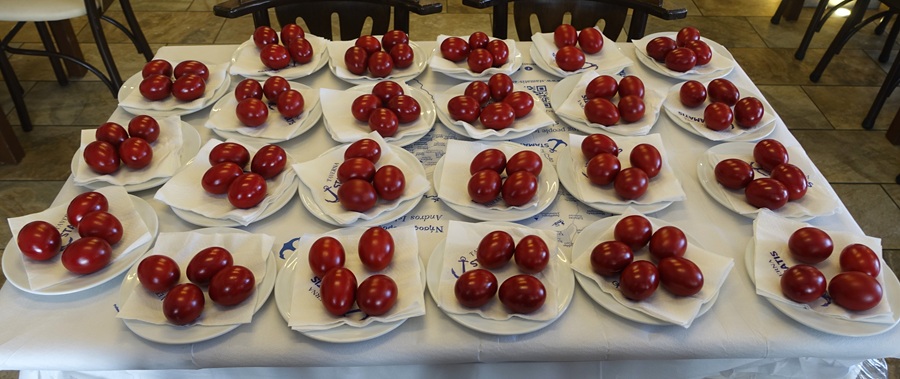 Ένα τραπέζι γεμάτο κόκκινα αυγά για την περίσταση. Στο εστιατόριο του Σταμάτη. Εδώ θα φάνε κυρίως επισκέπτες. Οι κάτοικοι και οι φίλοι τους θα φάνε στα σπίτια τους μέρα που είναι...