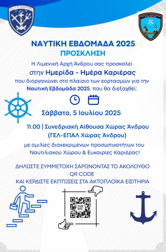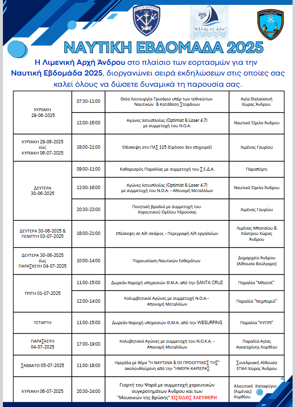 Το Λιμεναρχείο Άνδρου στα πλαίσια της αναβίωσης του σημαντικού θεσμού της Ναυτικής Εβδομάδας από το υπουργείο Ναυτιλίας διοργανώνει από 29-06-2025 έως 06-07-2025 σειρά σημαντικών εκδηλώσεων σε όλο το νησί με στόχο την αγάπη προς τη θάλασσα, την εμφύσηση του ναυτικού πνεύματος στους νέους και στις νέες της Ελλάδας και την προσέλκυσή τους στα ναυτικά επαγγέλματα, που ανέδειξαν την πατρίδα μας σε μια από τις κορυφαίες ναυτικές δυνάμεις της εμπορικής ναυτιλίας παγκοσμίως.