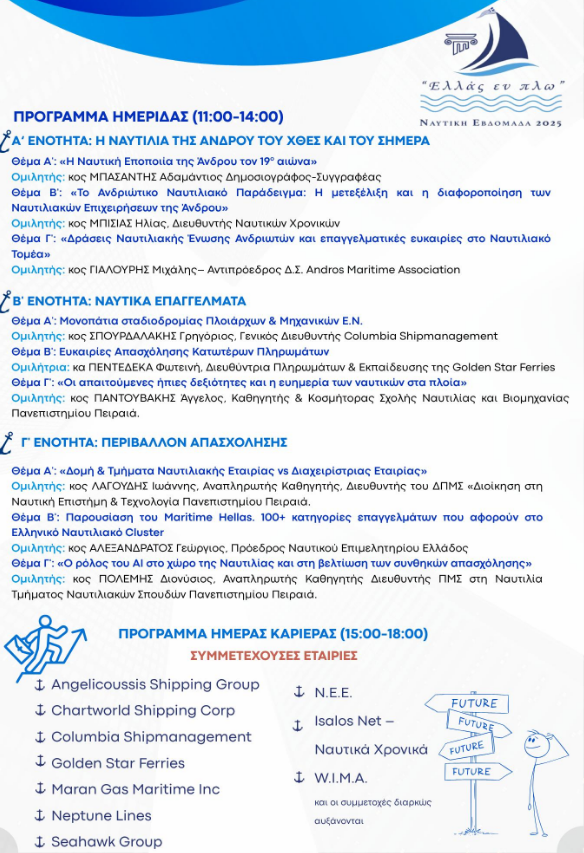 Στην ημερίδα για την ημέρα καριέρας το Σάββατο 5 Ιουλίου συμμετέχουν μερικές από τις μεγάλες ναυτιλιακές εταιρείες της Ελλάδας και της Άνδρου : Angelikoussis Shipping Group, Chartword Shipping Corp, Columbia Shipmanagement, Golden Star Ferries, Maran Gaw Maritime Inc, Neptune Lines, Seahahawk Group