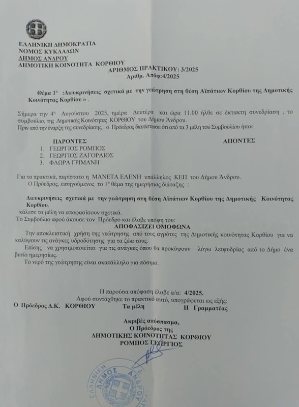 (Λάβαμε και δημοσιεύουμε δύο έγγραφα για το νερό. Το πρώτο έχει ημερομηνία 4 Αυγούστου της Δημοτικής Κοινότητας Κορθίου και αναφέρεται σε διευκρινήσεις σχετικά με το νερό γεώτρησης στ' Αϊπάτια, την χρήση του και την καταλληλόλητα του. Το δεύτερο έχει ημερομηνία 20 Αυγούστου και είναι επίσημα ερωτήματα προς τον δήμαρχο Άνδρου από τον δημοτικό Σύμβουλο Κ. Θωμά και ζητά να δοθούν στη δημοσιότητα οι πρόσφατες αναλύσεις του Δήμου για το νερό στις περιοχές Χώρας, Γαυρίου, Μπατσίου, Κορθίου και Μεσαριάς. Με δεδομένη την γνώση όλων περί της ποιότητας του νερού που τρέχει από τις βρύσες είναι λογικό να δοθούν και για τα δύο έγγραφα απαντήσεις από τον δήμαρχο - ΕΝ ΑΝΔΡΩ)
