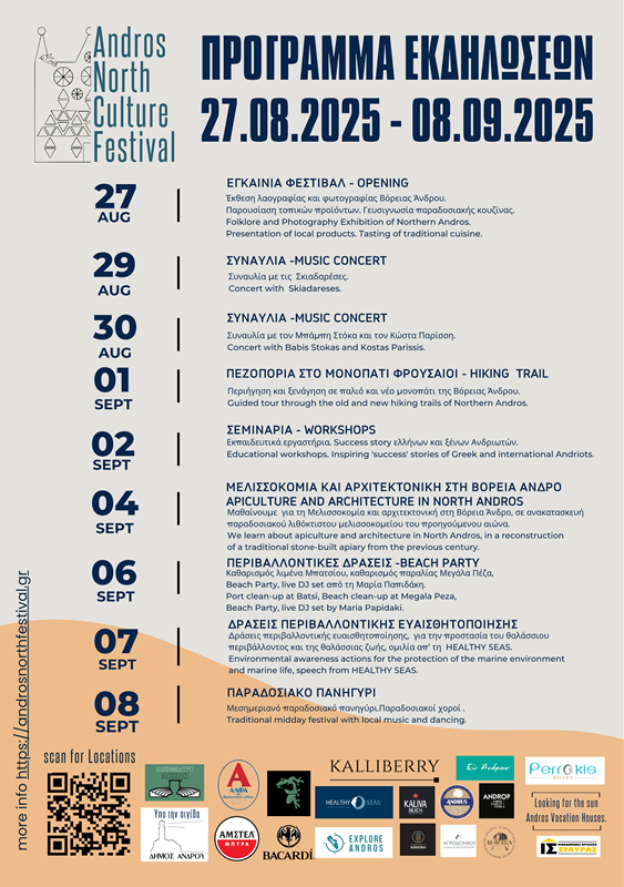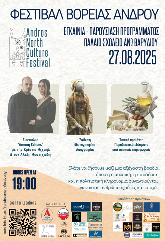 Με ιδιαίτερη χαρά σας προσκαλούμε στα εγκαίνια του Andros North Culture Festival 2025, μιας πολυθεματικής γιορτής αφιερωμένης στη διαγενεακή σύνδεση, τη βιώσιμη ανάπτυξη, τη συλλογική δράση και την ανάδειξη του φυσικού περιβάλλοντος και του πολιτιστικού πλούτου της Βόρειας Άνδρου.