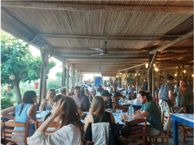 Φαντάσου κάτι ανάμεσα σε κρητικό γάμο και πανηγύρι στην Ικαρία. Υπάρχουν υπερβολικά πολλά τραπέζια, απλωμένα όπου κι αν κοιτάξεις. Και γύρω τους, διακόσια άτομα, μπορεί και τρακόσια, ενώ συνεχώς καταφτάνουν καινούργιες πεινασμένες παρέες. Οι σερβιτόροι δεν είναι απλά γρήγοροι, μου φαίνεται ότι τα πόδια τους δεν ακουμπούν καν στο έδαφος, σίγουρα πρέπει να πετάνε. Δεν θέλω ούτε να ξέρω τι επικρατεί στην κουζίνα…