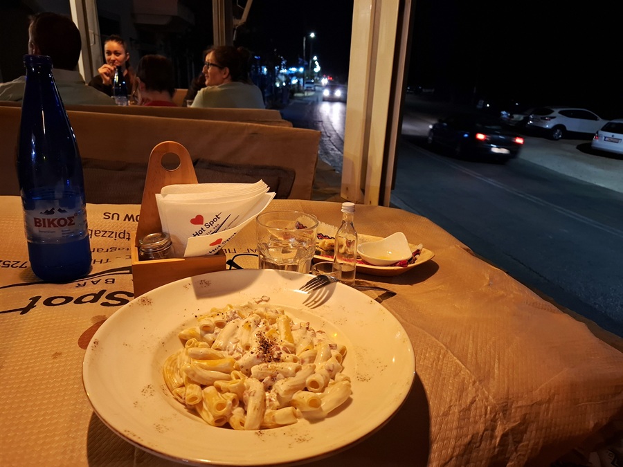 Η πιτσαρία του Γιώργου Συρίγου, στην ευθεία του Αγίου Πέτρου, κέρδισε με την μάχη του καλοκαιριού. Και συνεχίζει στην μάχη του φθινοπώρου. Εκτός από τις χειροποίητες πίτες και το ζυμωτό ψωμί έχει και χειροποίητα μακαρόνια και πένες. Σταθερή παρουσία, σταθερή ποιότητα, σταθερές τιμές. Στη φωτογραφία πένες καρμπονάρα. Στα προκαταρτικά: δικό του ψωμί και λάδι με ντομάτα...
