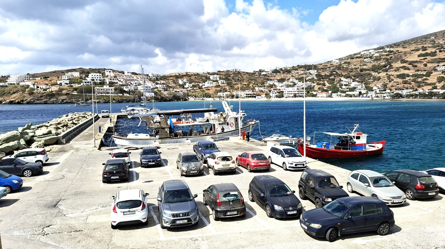 Μπατσί, απομεσήμερο Παρασκευής. Δύο ψαράδικα κι ένα ιστιοφόρο στην μαρίνα. Και αρκετά αυτοκίνητα.