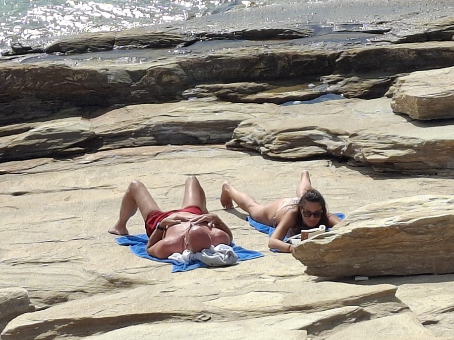 Στα βράχια έξω από την μαρίνα δύο τουρίστες - προφανώς ξένοι - κάνουν ηλιοθεραπεία. Η γυναίκα διαβάζει ένα βιβλίο. Απ' ότι φαίνεται μόνο οι γυναίκες πια διαβάζουν βιβλία!...
