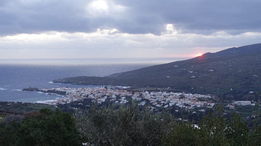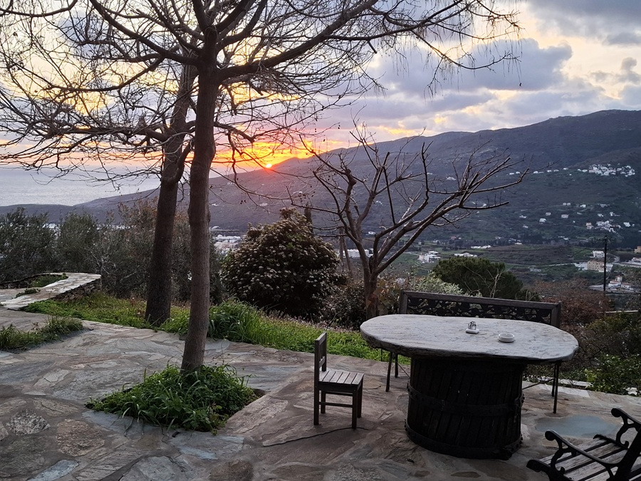 Ξημέρωμα στην χειμωνιάτικη Άνδρο. Μια πρώτη ματιά στην αυλή, έξω από την μπαλκονόπορτα της κρεβατοκάμαρας. Ο ήλιος χρυσοπόρφυρος καλημερίζει το νησί. Όποιος δεν έζησε τη στιγμή χάνει πολλά...