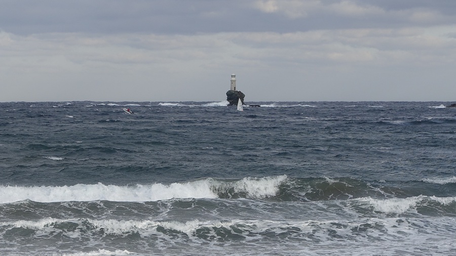 Τα παιδιά που έχουν απομείνει στο νησί ακόμα και ακόμα και με 5 μποφόρ παλεύουν με το κρύο και τα κύματα μπροστά στον φάρο...