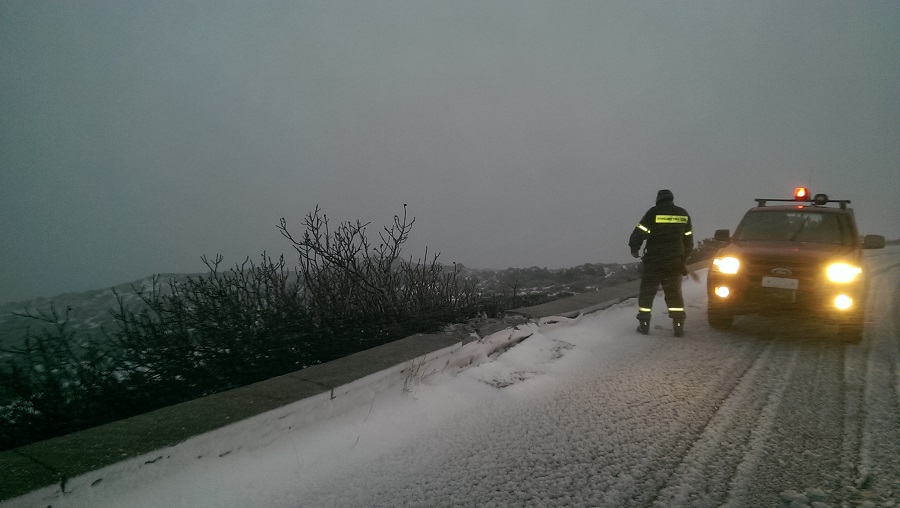 10/2/2015 - Όσο βραδιάζει το στρώνει και στον δρόμο. Το περιπολικό της πυροσβεστικής εξετάζει τον δρόμο για να δει κατά πόσο είναι βατός.