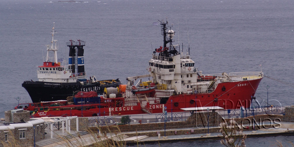 Τα "r/z Aegis 1" της εταιρείας Τσαβλίρη και δίπλα το δεύτερο ρυμουλκό της ίδιας εταιρείας λίγο πριν έρθουν Άνδρο