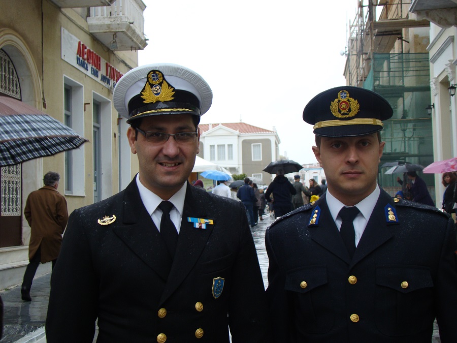 Ο λιμενάρχης Άνδρου και ο επικεφαλής τηε πυροσβεστικής Άνδρου: υπό βροχή με στολή και χωρίς ομπρέλα. Όχι παίζουμε...