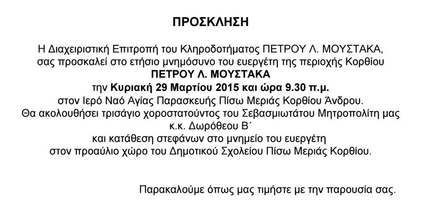 Η Διαχειριστική Επιτροπή του «Μουστάκειου Κληροτήματος» καλεί τους Κορθιανούς, αλλά και όλους τους Ανδριώτες στην ετήσια επιμνημόσυνη δέηση την οποία θα παρακολουθήσουν και οι τοπικές και κυκλαδικές αρχές: