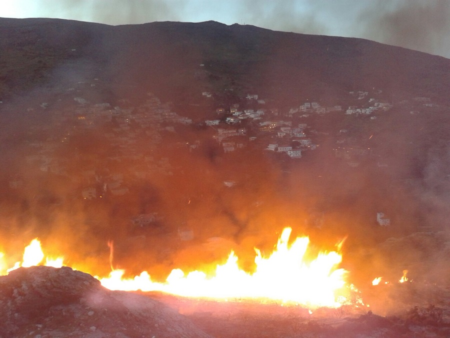 Πανοραμική φωτογραφία της πυρκαγιάς. Απέναντι διακρίνονται οι Στενιές ενώ στη θέση της εκκλησίας διακρίνονται τα σμπάρα που συνέχιζαν να σκάνε. Ήταν μια κορύφωση του αναστάσιμου έθιμου της "ανατινάξης" των Στενιών, που ενίοτε καταλήγει και σε πυρπολισμό των γύρω περιοχών!!! Για τους άπιστους Θωμάδες θυμίζω πως Μεγάλη Τετάρτη από "εορταστική" φωτοβολίδα που την πήρε ο ισχυρός άνεμος, πριν τρια χρόνια, κόντεψε να καεί το Άνω Υψηλού.