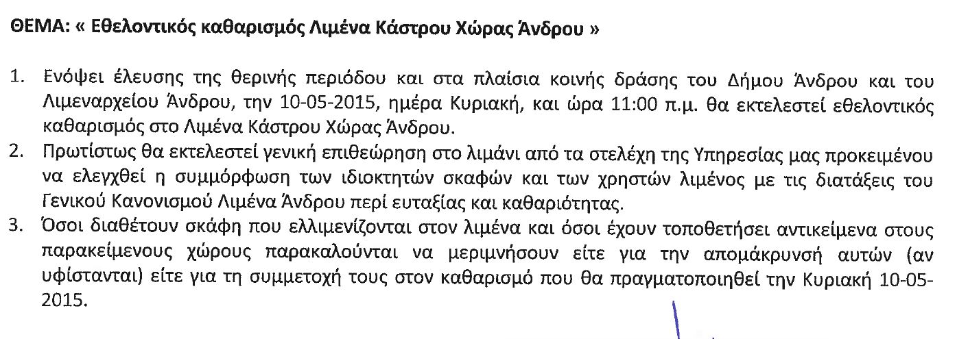 Το λιμαναρχείο Άνδρου στα πλαίσια των δραστηριότητων του και των ευθυνών του διενεργεί καθαρισμόμ του λιμανιού της Χώρας ενόψει καλοκαιριού και καλεί όλους τους ιδιοκτήτες σκαφών, αλλά και τους εκτελούντες εργασία να μαζέψουν τυχόν εργαλεία ή άλλα αντικείμενα που έχουν εκεί. Εγκαίρως και σωστά προειδοποιεί ώστε το λιμάνι να καθαριστεί και να προετοιμαστεί για το καλοκαίρι.