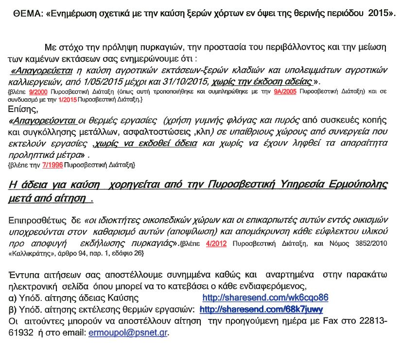 Η πυροσβεστική Άνδρου με μια πολύ αναλυτική ανακοίνωση της ζητά από τους πολίτες να είναι προσεκτικοί και αν χρειαστεί να βάλουν φωτιά σε ξερόχορτα κατά τους μήνες που υπάρχει απαγόρευση θα πρέπει (α) να ειδοποιήσουν με αίτηση τους το πυροσβεστικό σώμα, (β) να πάρουν μαζί με την πυροσβεστική όλα τα μέτρα προστασίας που θα τους επιδειχτούν, (γ) να γίνει η καύση σε συγκεκριμένη ώρα και μέρα.