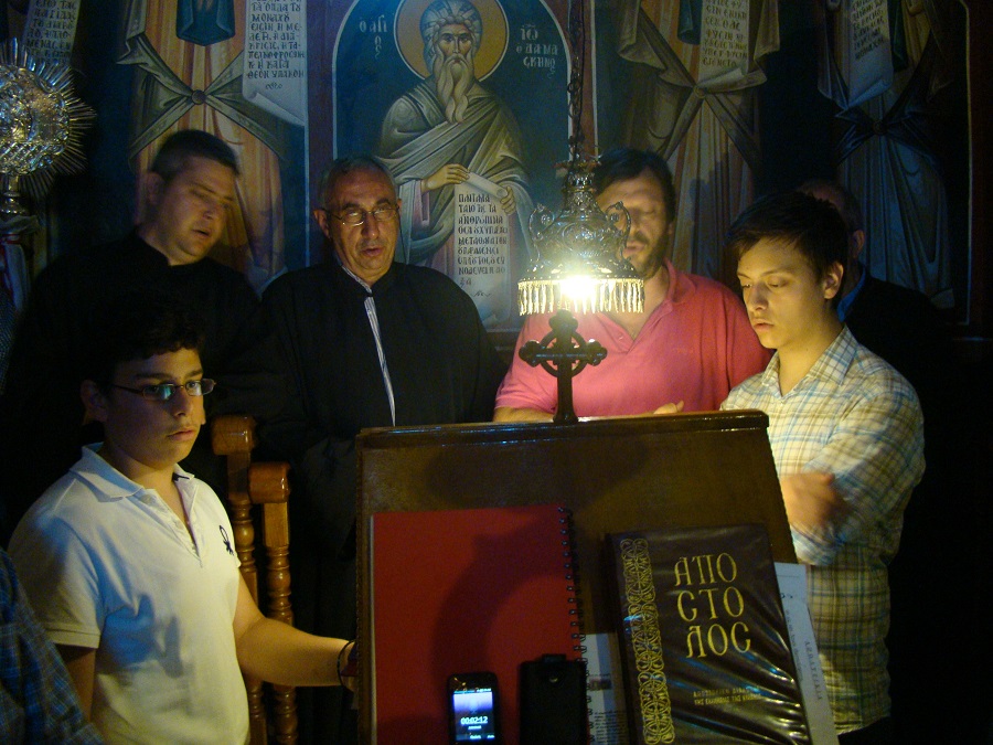Δύο στιγμές από την λειτουργία: άνω ο μητροπολίτης Δωρόθεος ΙΙ, κάτω η εξαιρετική ομάδα των ψαλτών.