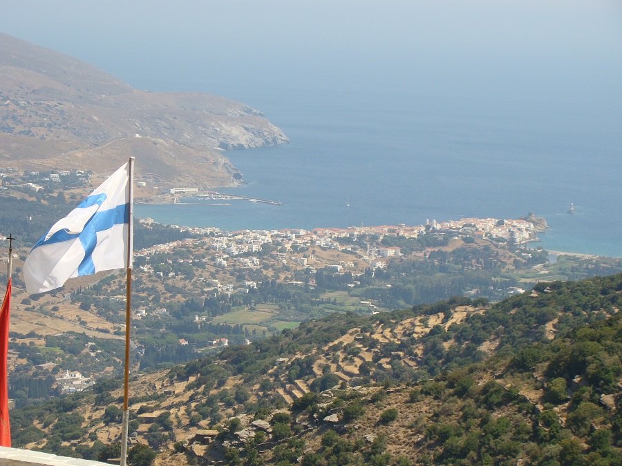 Από το μοναστήρι η θέα εκτείνεται μαγευτική μέχρι την Χώρα και το απέραντο Αιγαίο