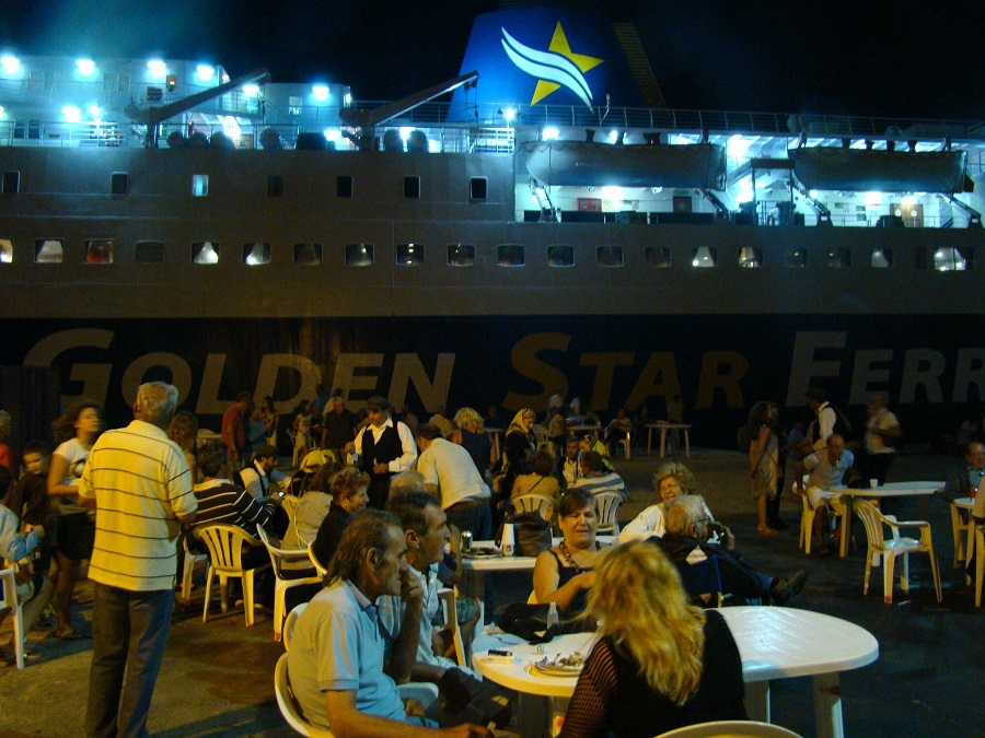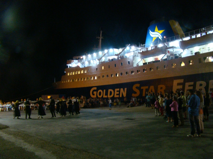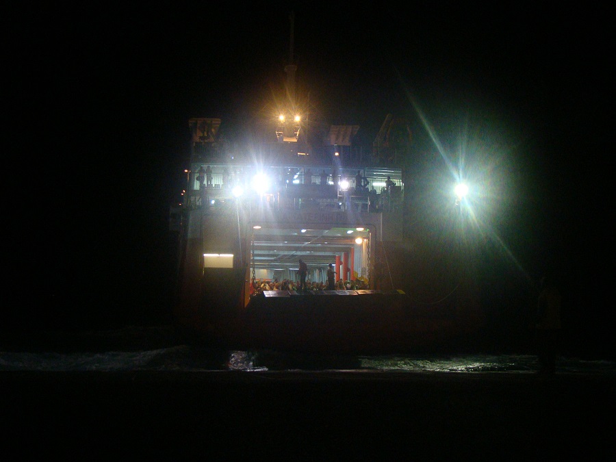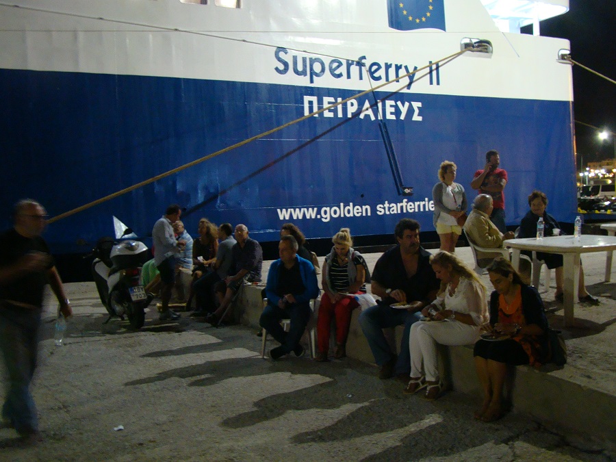 Καθώς πλησιάζαμε από μακριά η μουσική έμοιαζε να βγαίνει από το SuperFerryII! Νομίζαμε πως η αναγγελθείσα γιορτή των ψαράδων γινόταν μέσα στο πλοίο! Όμως όχι το πλοίο ήταν άδειο. Η γιορτή γινόταν …δίπλα του: πιο δίπλα δεν γινόταν. Γινόταν υπό τη νυχτερινή σκιά ή για να το πούμε καλύτερα υπό τον νυχτερινό φωτισμό του πλοίου.