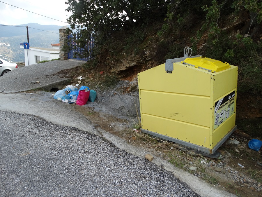 Απομεσήμερο. Ο κάδος ανακύκλωσης και τα σκουπίδια με τα μπάζα μπροστά στον αγωγό ομβρίων! Ιδού η μέριμνα μερικών κατοίκων! Υψηλού....