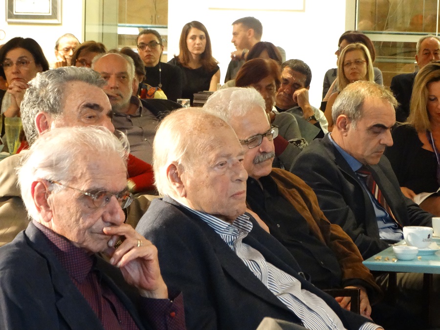 Στην πρώτη σειρά εξ αριστερών ο συγγραφέας Βασίλης Βασιλικός, ο πρώην υπουργός Γεράσιμος Αρσένης, ο συγραφέας Μίμης Ανδρουλάκης και ο γενικός γραμματέας του ΥΠΕΣ Γιάννης Καπάκης.