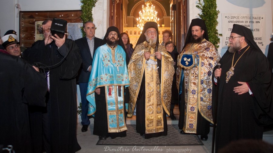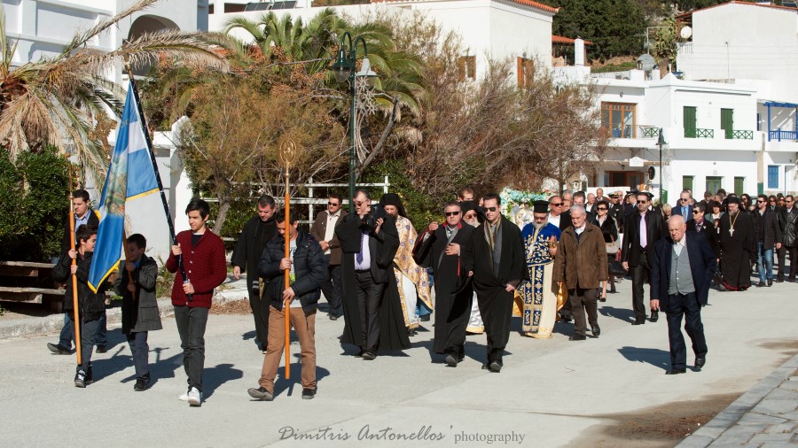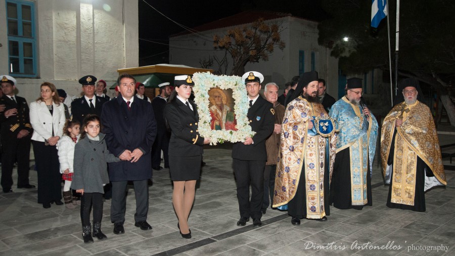 Η πομπή, αφού διέσχισε τον πεζόδρομο της «Αγοράς», σταμάτησε στο άγαλμα των Ηρώων στην Πλατεία και έφτασε στο λιμανάκι της περιοχής, όπου έγινε Τρισάγιο στην μνήμη των Πνιγέντων Ναυτικών καθώς και κατάθεση στεφάνων από επισήμους.