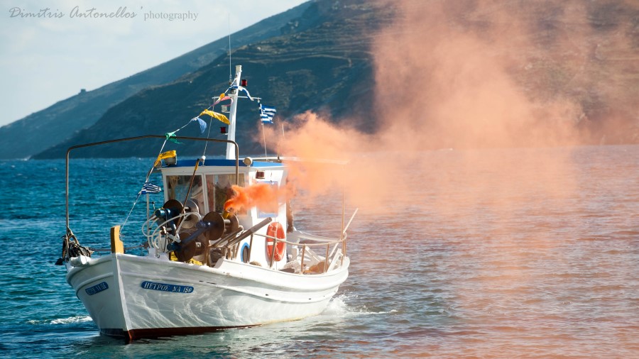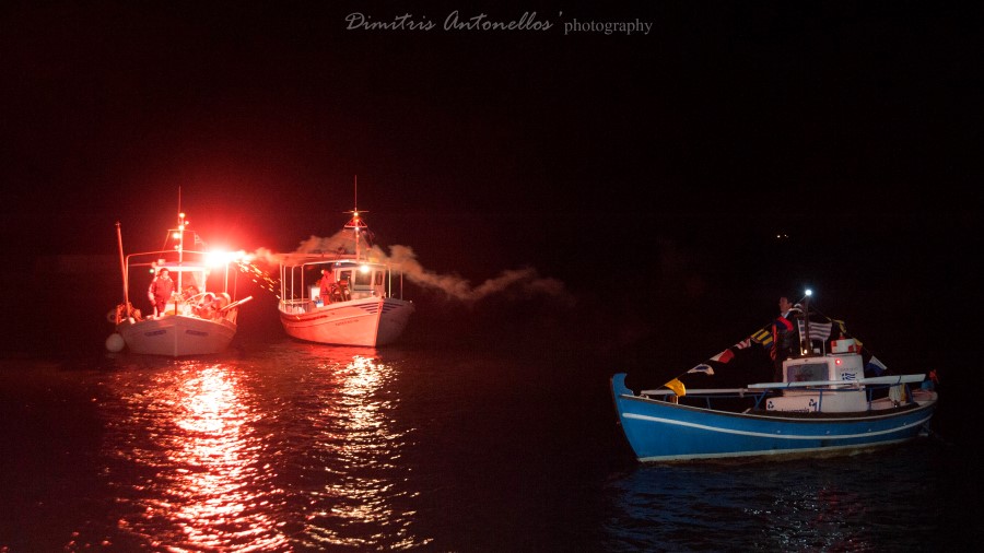 Καθ’ όλη τη διάρκεια του Τρισάγιου, ψαράδες της περιοχής είχαν βγει με τα βαρκάκια τους και φώτιζαν την θάλασσα με καπνογόνα λίγο πιο ανοιχτά από το χώρο συγκέντρωσης.