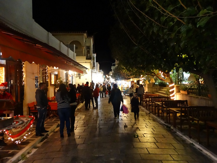 Πάμε πάλι πίσω στη Χώρα. Γύρω στις 21:15 σχόλασε η πλατεία, Οι πιο ηλικιωμένοι έφυγαν για σπίτι λόγω κρύου. Οι νεώτεροι έμειναν μέχρι αργά. Στις καφετέριες νεαροί και νεαρές. Στα σουβλατζίδικα πιτσιρικαρία. Μετά τις 22:30 έμειναν μέχρι αργά κυρίως νέοι. Αλλά κι αυτοί ήταν πολλοί. Και ψώνιζαν!!! Τουλάχιστον πούλησαν μερικά πουλόβερ ο Μιχάλης, μερικά ρολόγια ο Γιώργος, μερικά εισιτήρια τα πρακτορεία, κάτι ποτά η Αντωνία, μερικά βότανα ο Γιάννης…