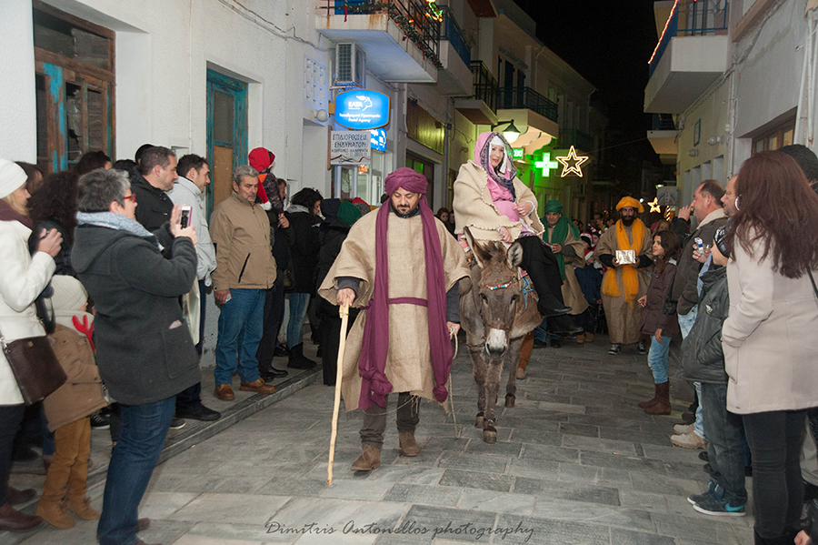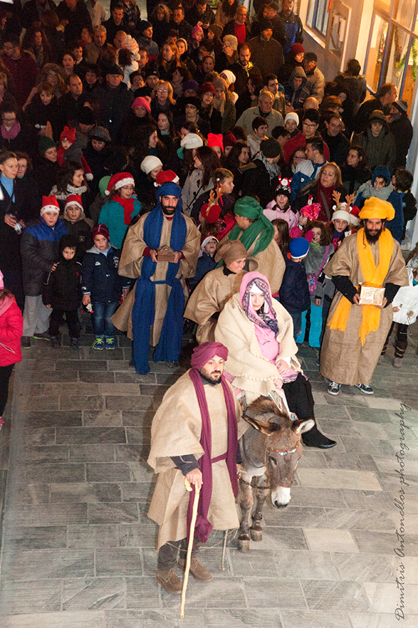 Μετά τις 8.30μμ ξεκίνησε η πομπή από την αρχή του πεζοδρόμου της αγοράς του Κορθίου, στο γεφυράκι του Ρωγιανού ποταμού. Ο Ιωσήφ, με την Παναγία, καθήμενη πάνω σε ένα γαϊδουράκι, οδηγούσαν μπροστά, και ακολουθούσαν πίσω ένας βοσκός, και οι τρεις μάγοι με τα δώρα τους. Ξωπίσω μικρά παιδιά τραγουδούσαν χριστουγεννιάτικα τραγούδια, με τις φωνές τους να γεμίζουν όμορφα τον χώρο και να προσθέτουν ένα ακόμη λιθαράκι στη ιδιαίτερη ατμόσφαιρα της στιγμής. Μια ατμόσφαιρα που μύριζε Χριστούγεννα και μετέφερε τη μαγεία των ημερών, μέσα από τα μάτια των παιδιών, αλλά και όλου του κόσμου που στεκόταν αριστερά και δεξιά του δρόμου.