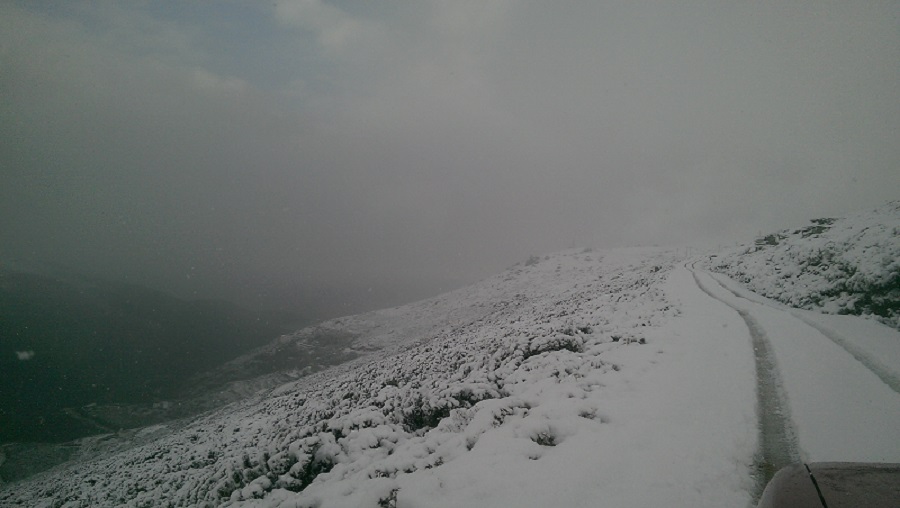 Ο δρόμος και η Βουρκωτή απέναντι μέσα στα χιόνια ώρα 9:30