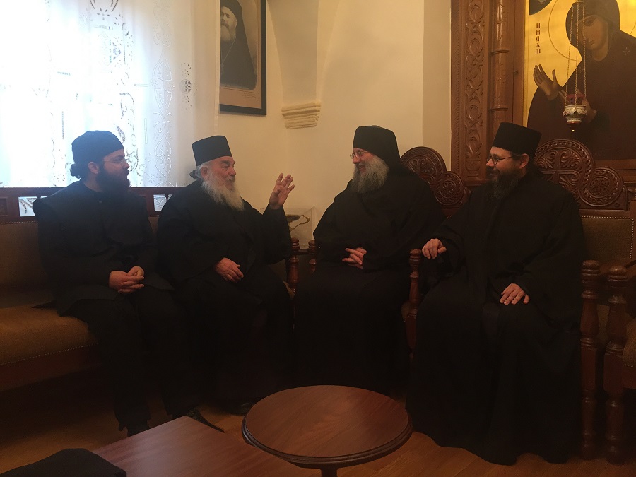 Ο μητροπολίτης Ταμασού και Ορεινής Ησαΐας συζητά με τον ηγούμενο Ευδόκιμο και μέλη της αδελφότητας της Παναχράντου.