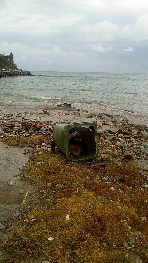 Σπασμένος κάδος και χυμένα σκουπίδια στην ακροθαλασιά του Παραπορτίου. Μήπως θα έπρεπε να τα μαζέψουμε πριν τα πάρει το κύμα; (φωτο: Μ. Πολίτου)