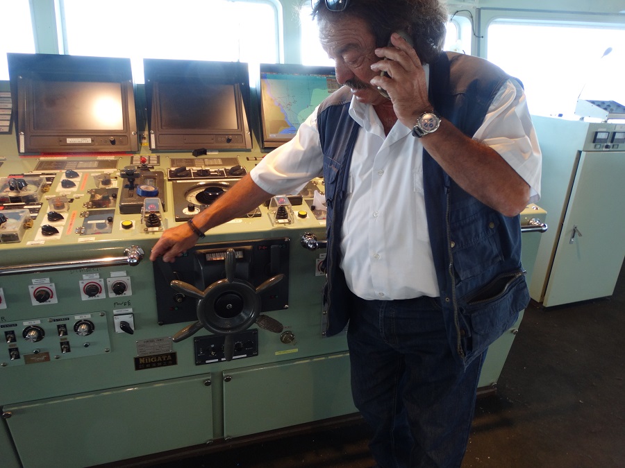 Και βέβαια πάντα πρώτος και την επόμενη μέρα και ο απαραίτητος καπετάν Τάσσος. Εδώ ελέγχει το τιμόνι!!! Ένα μίνι-τιμόνι. Το εξετάζουμε και το βρίσκουμε μικρό... και κοντό! "είναι κοντοί οι γιαπωνέζοι" σχολιάζει!!! "Αν ήταν ευρωπαϊκό θα ήταν 30-40 πόντους πιο πάνω. Άσε που μερικά πλοία πια δεν έχουν τιμόνι. Έχουν Joy-stick!!" (φωτο: Εν Άνδρω).