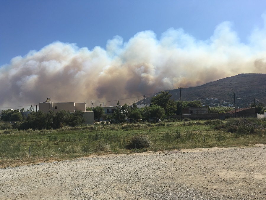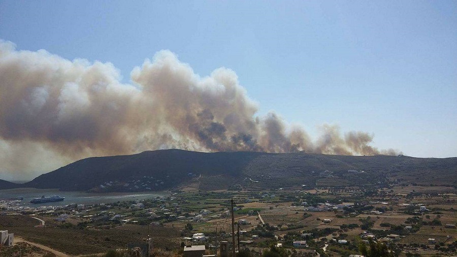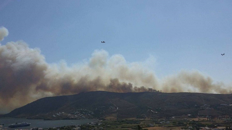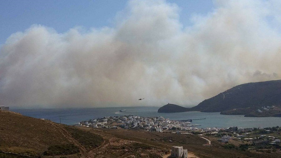 Διακρίνεται από το Γαύριο ο καπνός της μεγάλης φωτιάς και το Superferry στο λιμάνι. Φωτογραφίες για το Εν Άνδρω Σοφία Ντιναλέξη.