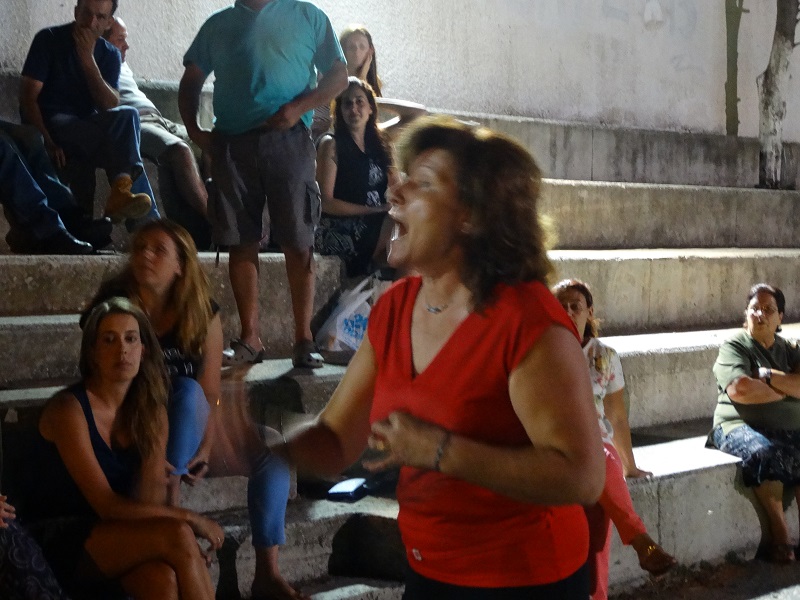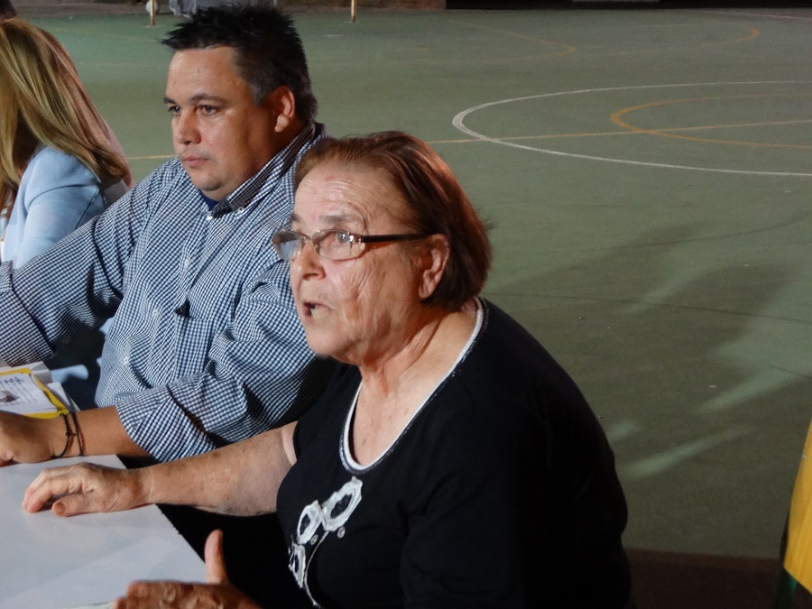 Η ηλικιωμένη κυρία που έθεσε μερικά νομικά και ηθικά ζητηματα για τις υποτροφίες του χωριού της και θύμισε τις απουσίες πολλών στο Μοστάκειο (φωτο: Εν Άνδρω).
